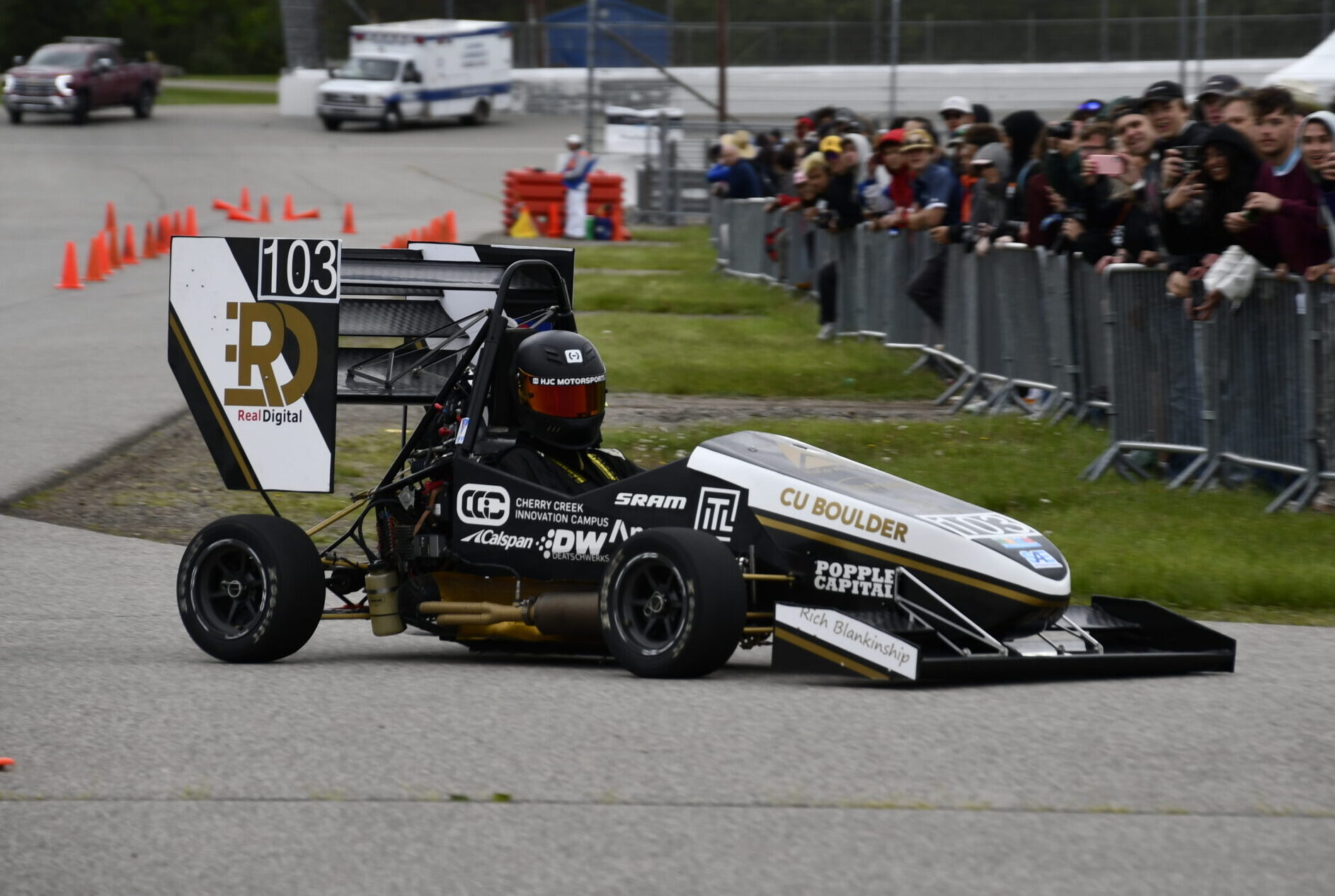 Each summer, the CU Boulder Racing Team travels Brooklyn, Michigan along with over 120 other teams from around the world to compete in both dynamic and static events. Dynamic events give the teams a chance to prove their car mechanically while static events give scores for design, cost, and business model. Together, the dynamic and static scores are used to decide the winner. Once a car has competed, it is ineligible to compete again, meaning the process starts all over again. This gives students the opportunities to make iterations to their designs year after year.